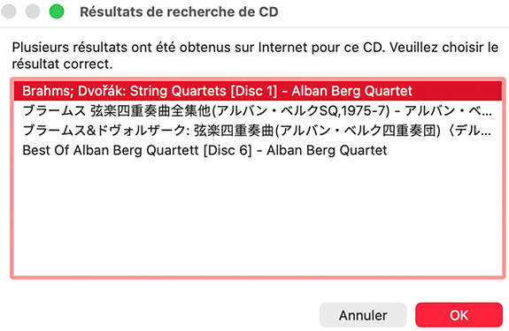 L’application fait une recherche sur Internet pour trouver les étiquettes et l’image de la pochette qui vont avec votre CD. Choisissez ce qui correspond au meilleur choix et cliquez sur OK.
