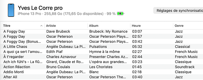 En le sélectionnant, vous retrouvez la musique sur l’appareil et le bouton de Réglages de synchronisation.