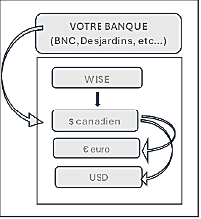 À l’ouverture du compte, il faut aussi faire la demande pour une carte bancaire débit Visa ; c’est l’équivalent d’une carte débit. Lorsque je suis en voyage, je paie mes dépenses avec cette carte parce qu’elle est rattachée à mon portefeuille en euros. Plus de stress si le taux de change monte pendant mon voyage. De plus, le portefeuille en euros a un numéro IBAN, numéro standard des comptes bancaires européens. Ceci me permet de virer de l’argent vers un résident européen. Je n’ai pas ouvert de portefeuille en dollars américains, mais je suppose qu’il suit les normes des banques américaines. Comme il s’agit d’une carte de débit, je peux aussi retirer de l’argent dans la plupart des guichets automatiques, sans frais et sans taux de change, c’est déjà converti. On peut aussi ajouter cette carte à votre portefeuille numérique et payer avec votre téléphone.