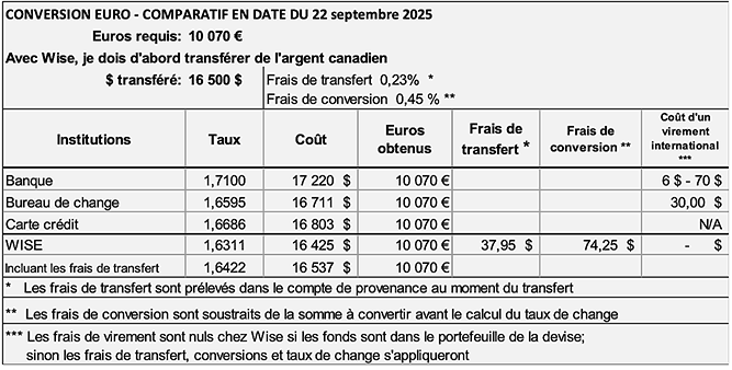 Y a-t-il des frais ? Oui, bien sûr. Il y a des frais pour transférer de votre compte vers le compte Wise. Il y a aussi des frais de conversion lorsqu’on demande de convertir les dollars canadiens en euros et, bien sûr, le taux de change. Mais, comme vous pourrez le constater dans le tableau plus bas, pour obtenir 10 070 € avec Wise, il faut débourser 16 537 $ incluant les frais et le taux réel de conversion reste quand même le plus bas. On n’économise pas une fortune, vous me direz, mais on y gagne en paix d’esprit et en sécurité, car il n’y a pas besoin de transporter tout cet argent sur nous.  Et si, par malchance, on se fait voler notre carte, on va sur l’application pour geler la carte, comme on le ferait avec une carte de crédit.