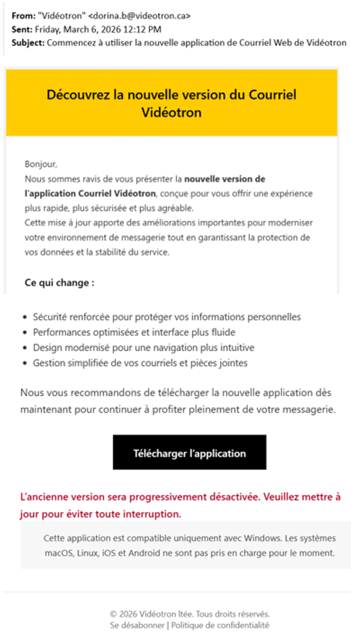 Tout d’abord, voici le courriel. Le courriel semble provenir de Vidéotron et il invite le lecteur à télécharger une application. Si le lecteur télécharge l’application, il ouvrira la porte à un virus qui infectera son ordinateur.