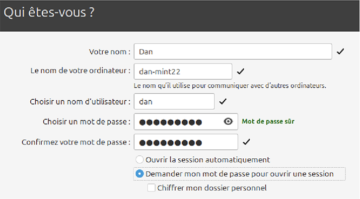 - À la fenêtre suivante, inscrivez votre nom ou un acronyme, un nom d’utilisateur et choisissez un mot de passe robuste. Si vous le désirez, vous pouvez changer le nom de l’ordinateur, à votre choix, mais sachez qu’il ne doit pas y avoir d’espaces dans le nom. Cliquez Continuez.
