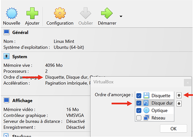 De retour à la fenêtre de VirtualBox, nous allons changer l’ordre des périphériques d’amorçage de cette VM.