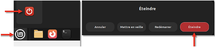 Donc, pour éteindre la VM de manière correcte, cliquez sur l’icône LM en bas à gauche de votre fenêtre Linux Mint, puis sélectionnez l’icône représentant un interrupteur. Confirmez ensuite votre choix en cliquant sur Éteindre.