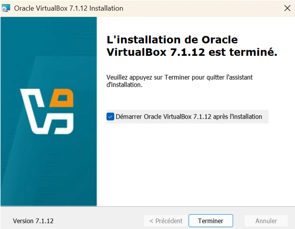 L’installation de VirtualBox est assez simple. Double-cliquez sur le fichier téléchargé dans votre dossier Téléchargements. Le fichier se nomme VirtualBox-7.1.12-xx… Au moment de la rédaction de cet article, la version disponible est la 7.1.12. Il se peut que ce nombre soit différent pour vous en fonction des mises à jour.