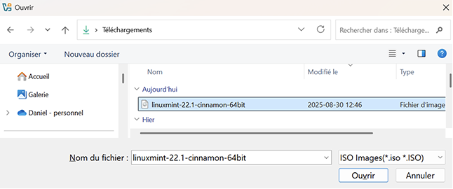 Dans la nouvelle fenêtre, naviguez jusqu’à votre dossier Téléchargements et sélectionnez le fichier ISO que vous avez téléchargé précédemment. Cliquez le bouton Ouvrir.