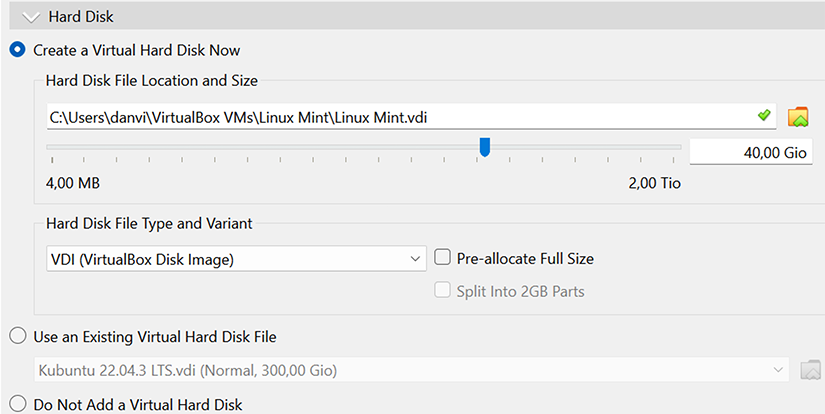 Cliquez sur la flèche à gauche, au côté de Hard Disk pour voir cette section. Ici, le minimum suggéré par VirtualBox est de 25 gigaoctets. Si vous avez l’espace disponible sur votre disque dur, vous pouvez porter ce nombre à 40 gigaoctets, bien que tout cet espace ne sera pas alloué.