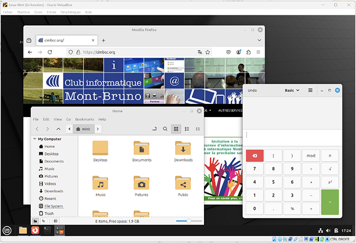 Lors du premier lancement de cette VM, celle-ci fonctionnera dès le lancement. En fait, Linux Mint vous permet de l’essayer avant de l’installer. Par exemple, dans la fenêtre suivante, j’ai démarré le fureteur Firefox sur la page du Club et j’ai ouvert également l’explorateur de fichier ainsi que la calculatrice.