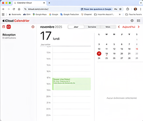 L’intégration des appareils Apple est là pour nous faciliter la vie. Lorsque vous avez différents systèmes, c’est faisable, mais le chemin est plus compliqué. Avec une autre marque d’appareil, il est possible d’aller avec votre fureteur accéder à www.icloud.com pour voir vos informations. Par exemple, après avoir entré votre nom d’utilisateur et votre mot de passe, on peut accéder à l’application Calendrier :