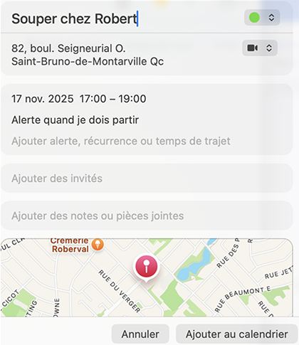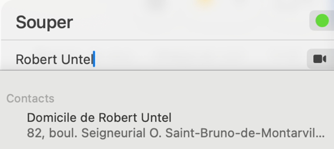 Je constate alors que la plage horaire est libre. Pour compléter le rendez-vous, je veux ajouter l’adresse. J’écris le nom dans le lieu, l’application me propose l’adresse de son domicile qui est déjà dans mes Contacts.