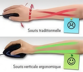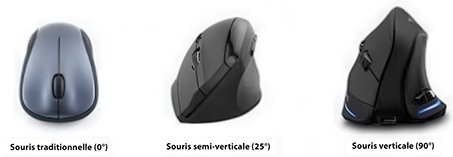 Il y a les souris avec fil, sans-fil et rechargeables, de même que celles utilisant Bluetooth qui peuvent être utilisées avec une tablette ou un téléphone. J’ai aussi découvert les souris ergonomiques. Avec une souris classique, le mouvement fait pour la tenir et la manipuler n’est pas naturel et entraîne une torsion des muscles de l’avant-bras.