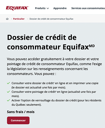 Le lien vers le site Equifax dans l’article pointe vers la page d’accueuil de TransUnion. Le lien pour Equifax est plutôt celui-ci : https://www.equifax.ca/fr/personnel/produits/dossier-de-crédit-de-consommateur/