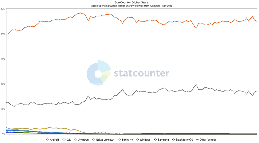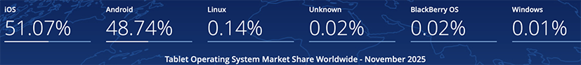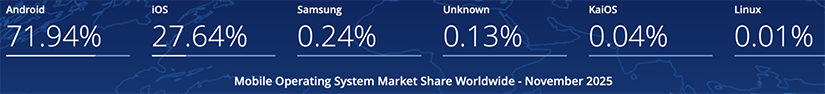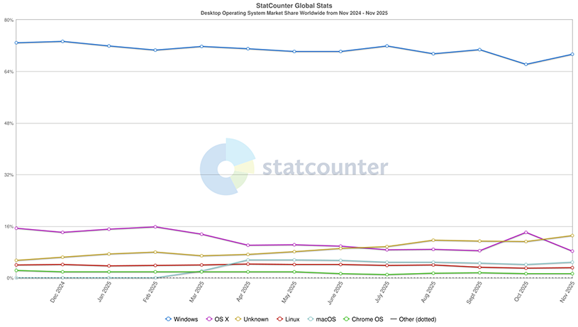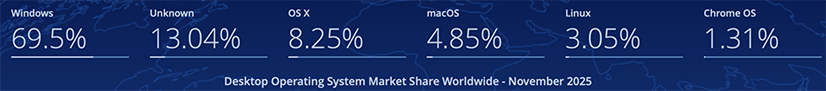 Le dernier graphique publié en novembre 2025 concernant les OS en utilisation et qui couvre une année pour le monde entier est le suivant :
