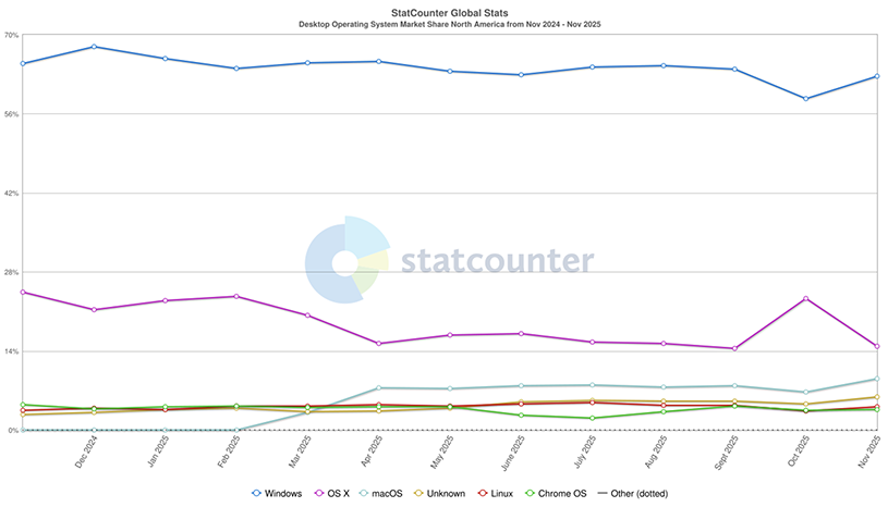 Par ailleurs, si nous examinons les mêmes données, mais uniquement pour l’Amérique du Nord, nous avons une perte encore plus marquée du côté Windows et une hausse du côté macOS.