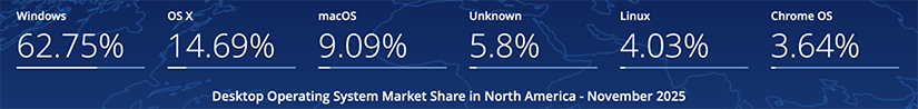 Il est intéressant de s’attarder à la répartition des trois grandes familles de systèmes d’exploitation (OS) en utilisation dans le monde. Dans cet article nous tenterons une brève analyse de celle-ci, des tendances mondiales et nous explorerons quelques pistes de réflexion. Nous nous attarderons également au sort de Windows 11 en dressant un tableau du marché actuel.