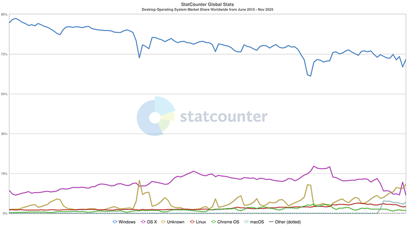 Dans cette décennie, Windows est passé d’une part de marché mondiale de plus de 87% à une lente descente à 69,5%, soit une perte de 17,5%.