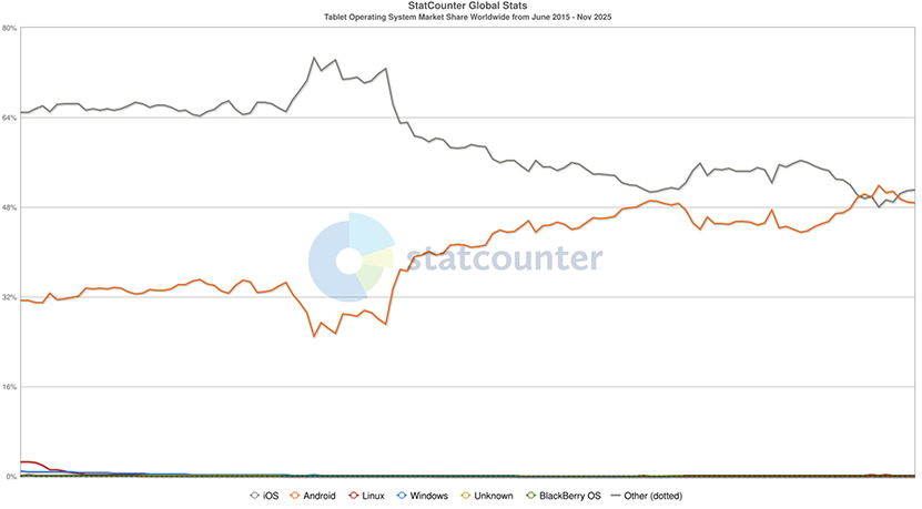Sur ce marché, Apple a une très légère avance face aux fabricants d’appareils utilisant Android, comme le montre le graphique suivant toujours sur une période de dix ans. Pour rappel, le premier iPad a vu le jour en 2010. Apple était précurseur dans ce domaine. Avant cela, le marché des tablettes était quasi inexistant.