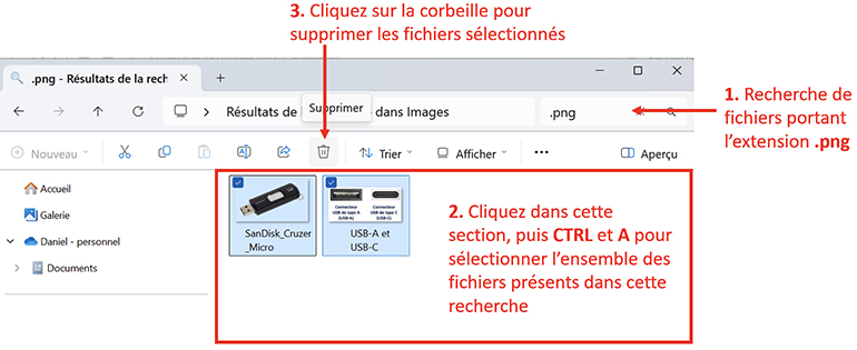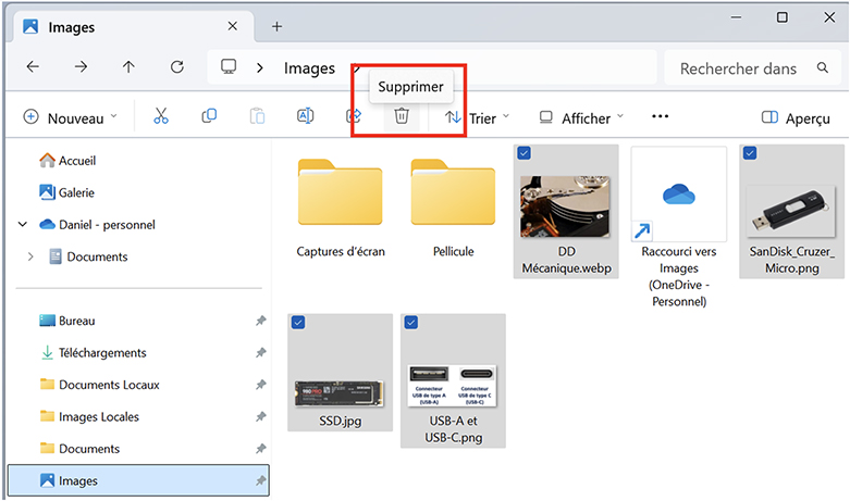 - Une fois votre sélection terminée, lâchez la touche Ctrl, puis cliquez sur la corbeille de l’explorateur pour supprimer les fichiers.