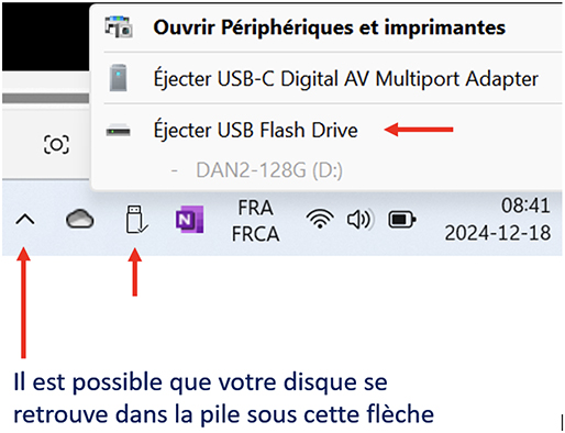 Pour ce faire, dans votre barre des tâches, au bas à droite, cliquez avec le bouton gauche de votre souris sur le petit symbole en forme de clé USB. Si vous ne le voyez pas, il est probablement regroupé sous la petite flèche qui pointe vers le haut.