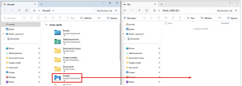 Dans l’explorateur de gauche, cliquez le bouton gauche de votre souris sur le dossier Images, gardez le bouton enfoncé, puis faites glisser celui-ci dans la grande portion de l’explorateur de droite, puis lâchez.