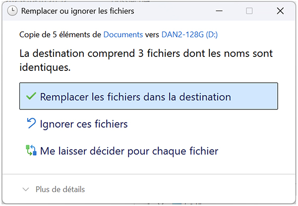 Lorsque vous effectuerez une nouvelle copie de sauvegarde, si le dossier ou un fichier est déjà existant sur votre disque externe, Windows vous offrira, soit de :