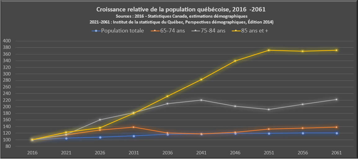 D’ici 2061, la population québécoise de 65 ans et plus connaîtra une forte croissance pendant que les groupes plus jeunes enregistreront une croissance beaucoup plus modérée. Et parmi ces aîné(e)s, ce sont les groupes les plus âgés qui auront la croissance la plus marquée, comme nous l’explique dans cet extrait vidéo le docteur Philippe Voyer, Ph. D. en sciences infirmières, dans un contexte de soin de santé à domicile.
