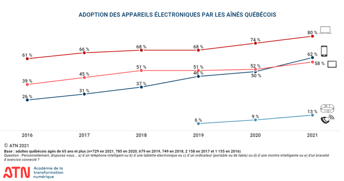 Le graphique suivant montre l’adoption croissante des appareils électroniques par les aîné(e)s entre 2016 et 2021.