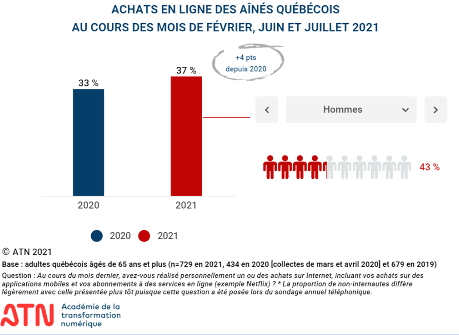Davantage d’aînés québécois ont acheté en ligne en 2021. Sur la base de trois collectes mensuelles distinctes pour des achats réalisés pendant les mois de février, juin et juillet 2021, 37 % des aînés québécois ont réalisé au moins un achat en ligne durant l’un ou l’autre de ces mois. Ceci représente une augmentation de 4 points de pourcentage par rapport à 2020.