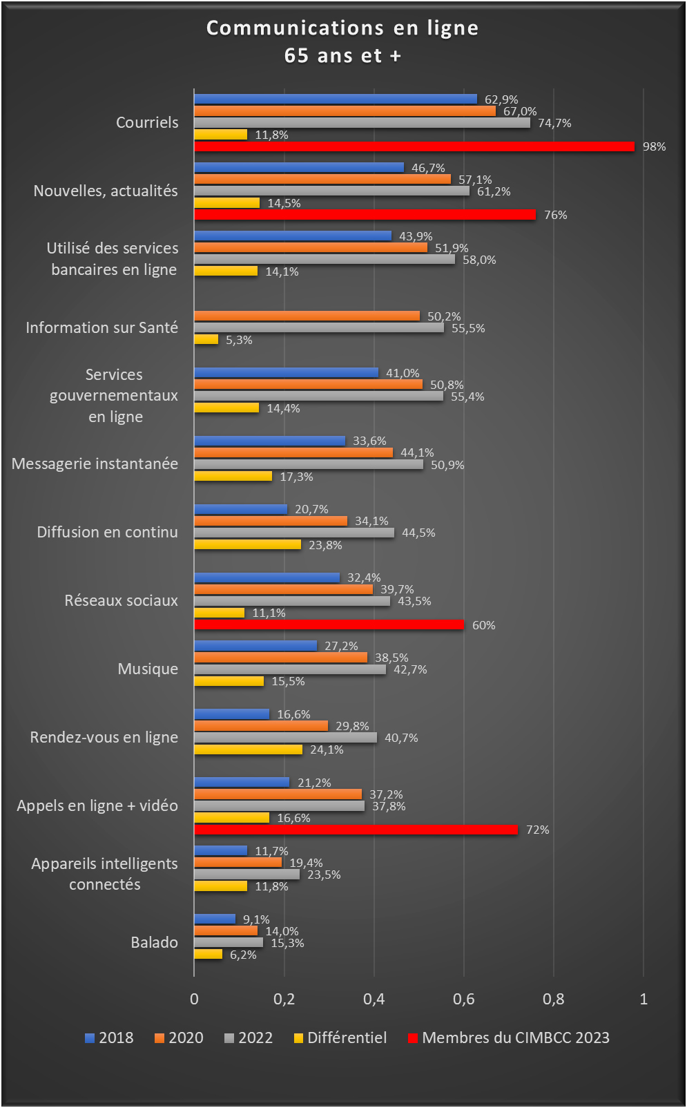 - Quant aux diverses activités en ligne, l’activité que ces personnes ont le plus fréquemment effectuée était l’utilisation des courriels. Environ trois personnes sur quatre de 65 ans et plus (74,7 %) ont envoyé et reçu des courriels en 2022, en hausse de 7,7 points de pourcentage par rapport à 2020. Au Club, c’est 98 %, comme vous pouvez le constater en haut de la figure précédente.