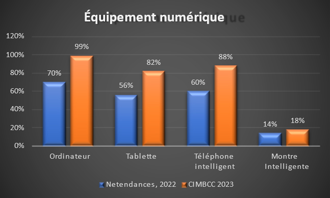 - 88 % des aînés disposent d’au moins un des appareils électroniques évalués, soit 7 points de plus qu’en 2019. Nous avons ajouté dans la figure précédente quelques résultats du dernier sondage du CIMBCC pour vous faire connaître la situation des membres du Club.