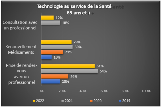 - 59 % des aînés ont utilisé un des outils Internet pour s’occuper de leur santé, soit 28 points de plus depuis 2019.