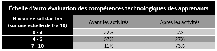- Après leur participation aux ateliers, c’est 73 % des participants qui considéraient comme élevé leur niveau de satisfaction de leurs compétences technologiques.