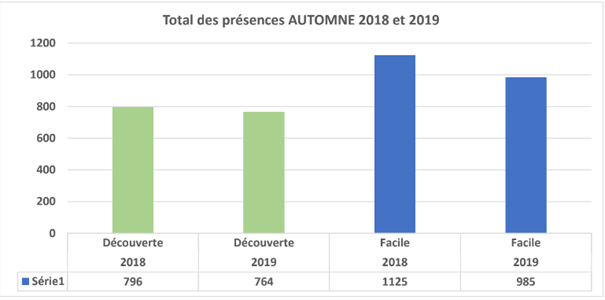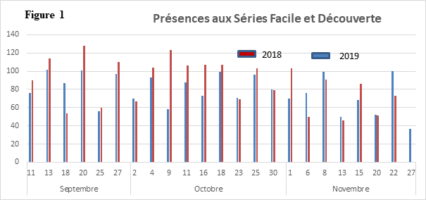 La figure 2 représente le total des personnes qui ont assisté en 2018 et 2019 aux différentes séances et illustre aussi la réduction de l’achalandage à la fois pour les séries Facile et Découverte.