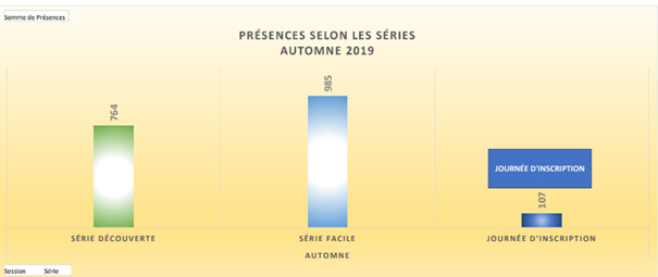 La figure 3 indique, comme par les années passées, que les séances de la série Facile sont plus courues que les séances de la série Découverte. Ce phénomène n’est pas nouveau, car il a été observé depuis quelques années.