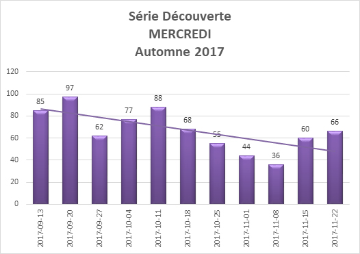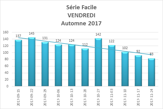 On remarque que la série Facile a connu un franc succès avec des présences au-dessus de 100 personnes sauf pour les deux dernières séances. Il existe aussi une tendance à la baisse tout au long de l’automne. Cette tendance se retrouve aussi avec la série Découverte.