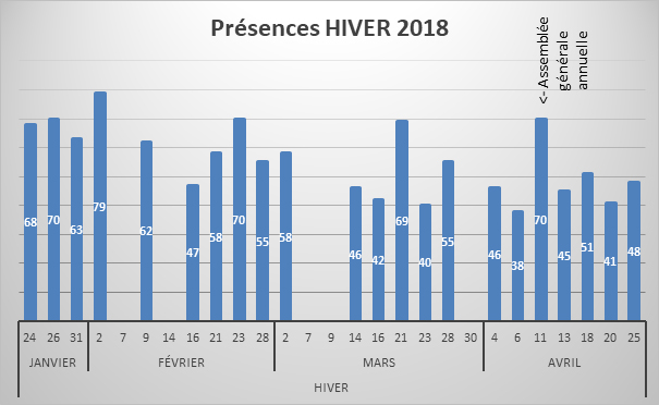 Pour cette période, 1221 personnes ont assisté aux présentations, incluant l’assemble générale annuelle. La figure suivante nous présente le nombre de personnes ayant participé aux séances du club. On y retrouve aussi la participation de 70 membres lors de l’assemblée générale annuelle le 11 avril.