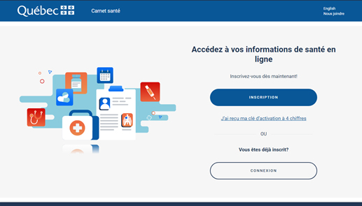 Une fois sur la page d’accueil de Carnet santé Québec, cliquez sur le bouton bleu Inscription.