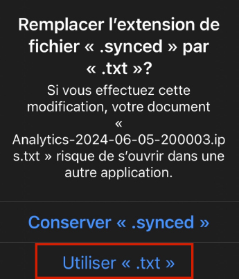Peu importe l’extension précédente du fichier, une demande de confirmation du changement d’extension apparaîtra. Choisissez Utiliser « .txt ».
