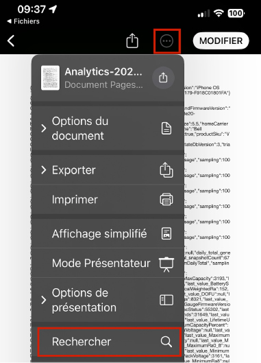 - Une fois le fichier ouvert dans Pages, nous allons effectuer une recherche pour un champ précis. Dans Pages, appuyez sur les trois petits points dans un cercle au haut de la fenêtre, puis choisir Rechercher.