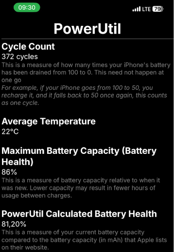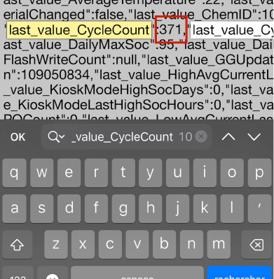 - Vous devriez obtenir un résultat similaire à l’image suivante. Dans mon cas, on peut voir que la valeur du nombre de cycles de charge est actuellement de 371. Pas mal pour iPhone 12 datant de 2020.