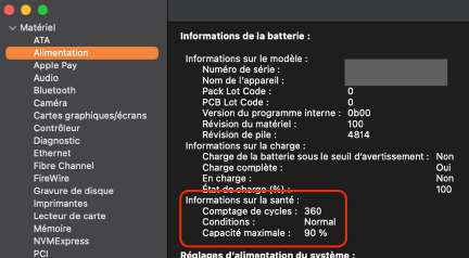 À la fenêtre qui s’affiche, dans la section de gauche, choisir Alimentation, puis repérez dans la section de droite Informations sur la santé : Comptage de cycles. Par exemple, sur mon MacBook, nous pouvons voir que j’en suis à 360 cycles de charge pour une capacité totale de 90%.