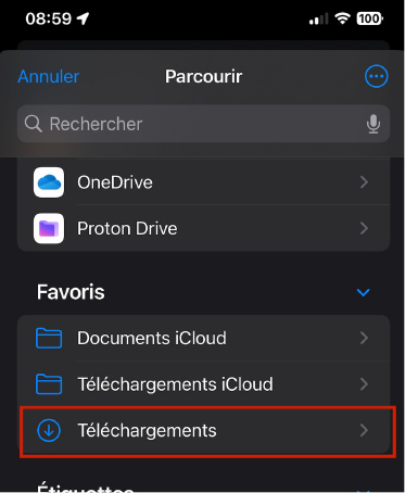 - À l’aide de l’application Fichiers sur votre iPhone/iPad, allez au même endroit où vous venez d’enregistrer le fichier, soit le dossier Téléchargements de votre appareil.