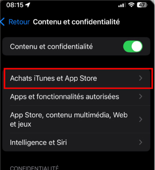 Appuyez deux fois sur Retour ou le symbole « < » en haut à gauche de l’écran pour revenir à la fenêtre Contenu et confidentialité.