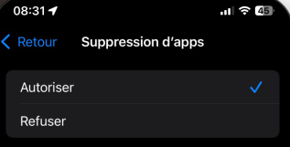 À la nouvelle page qui s’affiche, sous Suppression d’apps, vous avez fort probablement la mention Refuser. Appuyez dessus, puis choisissez Autoriser.