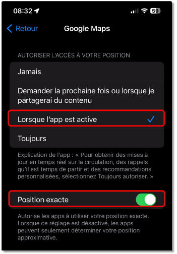 Notez que pour chaque application dont vous autorisez l’information de localisation, vous pouvez également autoriser ou non la localisation précise, c’est-à-dire au plus près de votre position réelle. Ceci n’est généralement pas nécessaire à l’exception des applications GPS telles que Plans et Google Maps ou l’application Localiser d’Apple.