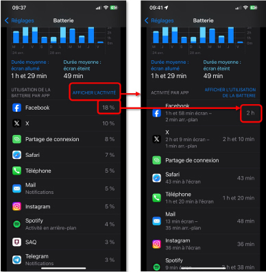 En y regardant de plus près, nous pouvons déceler les applications les plus énergivores en fonction du temps d’utilisation et le pourcentage d’énergie consommé.