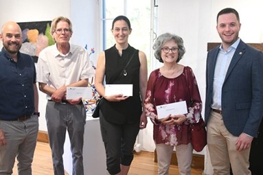 Johanna Griffith et Denise Rumpelmayr, qui est à droite de M. Ludovic Grisé Farand, maire de Saint-Bruno, sont les deux lauréates du concours en arts visuels 2022.