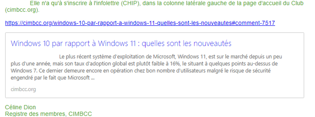 Profitez-en pour inviter votre destinataire à s’abonner à l’infolettre du Club. Il s’agit d’inscrire l’adresse électronique dans le champ au-dessus de la mention « JE M’INSCRIS », à gauche de la page d’accueil de ce site. C’est gratuit et, qui sait, peut-être aura-t-elle ou aura-t-il envie de devenir membre du CIMBCC ?