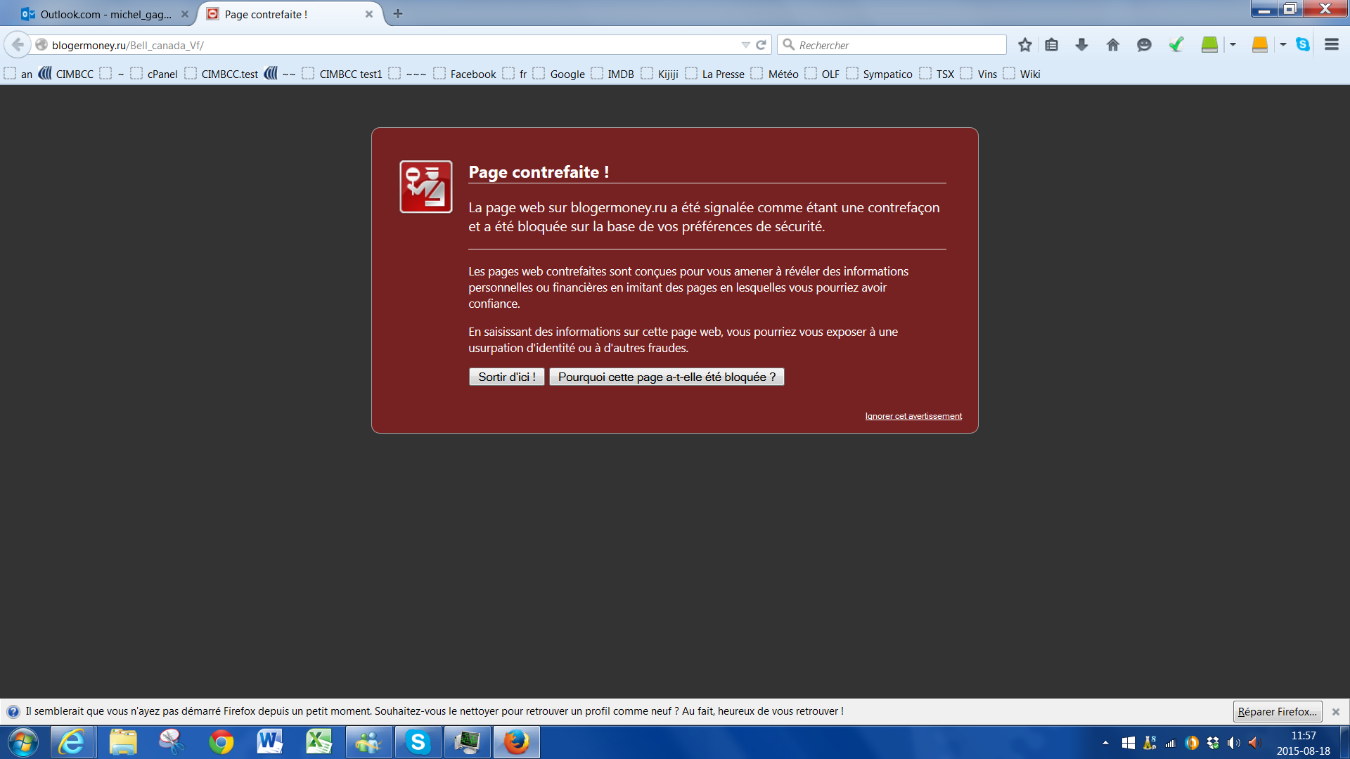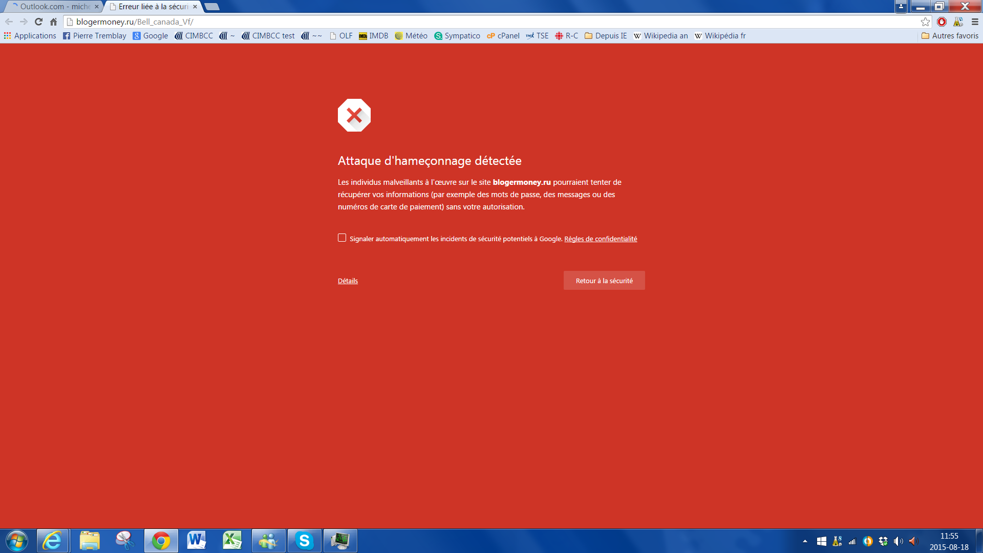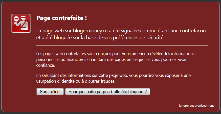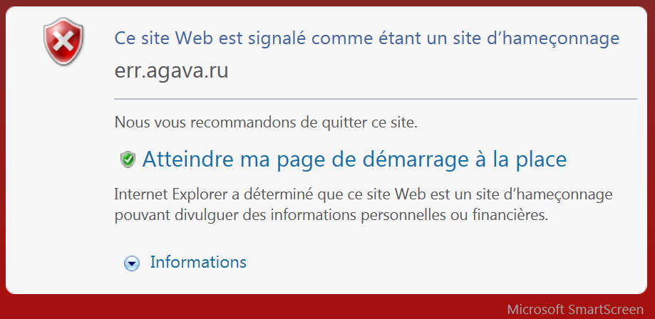 Alors que le 15 août, Internet Explorer m’amenait sur la page d’hameçonnage, dès le 16 août, il refusait d’afficher la page demandée et m’avertissait plutôt que la page était une page dangereuse.