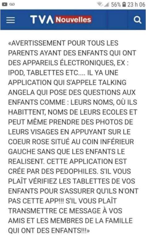 Le titre qui coiffe le texte semble indiquer que l’information vient du site de TVA Nouvelles. Le texte indique qu’il faut craindre l’application Talking Angela parce qu’elle aurait été développée par des pédophiles et qu’elle permet à des pédophiles de recueillir des informations sur des victimes potentielles. Évidemment, l’alerte se termine par une demande de partage.